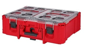 The MILWAUKEE® PACKOUT™ Deep Organizer has a 50lb weight capacity and is constructed with impact-resistant polymers to withstand harsh jobsite conditions. The weather seal has an IP65 rating that protects tools, accessories, and parts from rain and other jobsite debris. The organizer's interior features quick-adjust dividers and a deep design for holding both large fittings and small parts. The transparent lid of the organizer seals the compartments to prevent contents from migrating and traveling during transport. The PACKOUT™ modular storage system allows for storage customization to easily transport and organize tools and accessories.